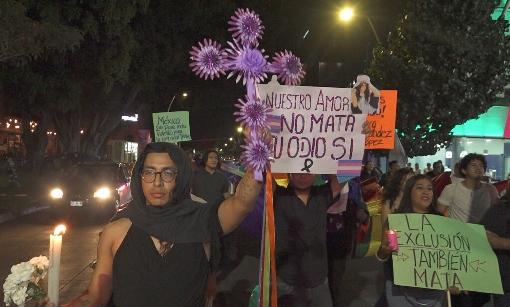 “Son 26 mujeres trans asesinadas este año en México, en Oaxaca no hay, pero hay violencia en contra de las mujeres trans“, gritaba una participante que encabezaba la protesta “No les olvidamos“.