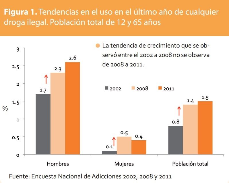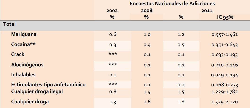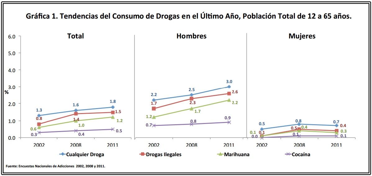 La Encuesta Nacional de Adicciones (ENA), el estudio más importante que se realiza a nivel nacional sobre las tendencias de consumo de tabaco, alcohol y drogas médicas e ilegales en jóvenes y adultos, señala que la mariguana es la primera droga de consumo en el país, y principalmente en la Ciudad de México, de acuerdo a datos de su más reciente estudio de 2011.