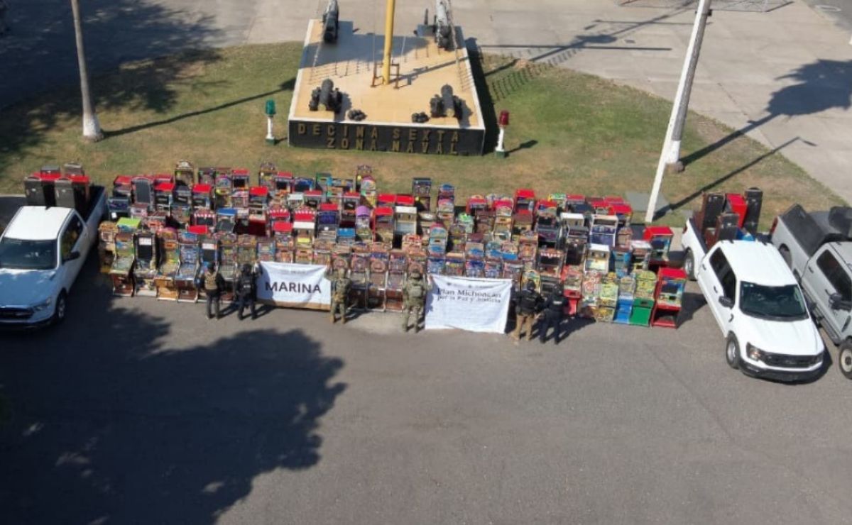 La Secretaría de Marina aseguró 185 “maquinitas” en Michoacán.