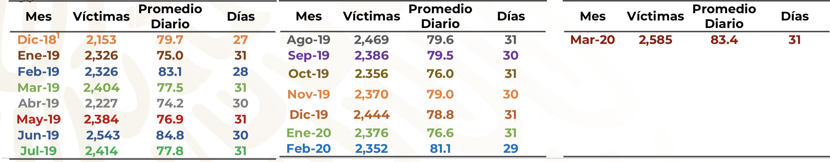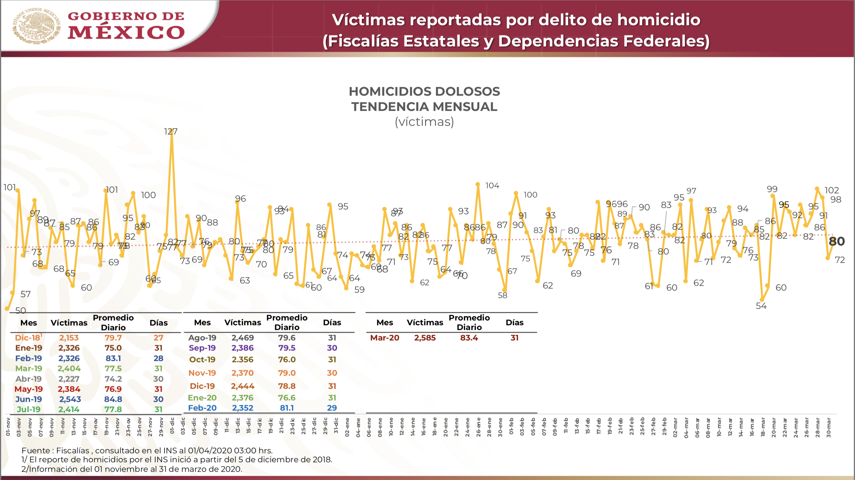 Marzo de 2020 se convirtió en el mes más violento desde que se lleva el conteo diario en este rubro en el presente gobierno federal, al registrar un total de 2 mil 585 homicidios dolosos.