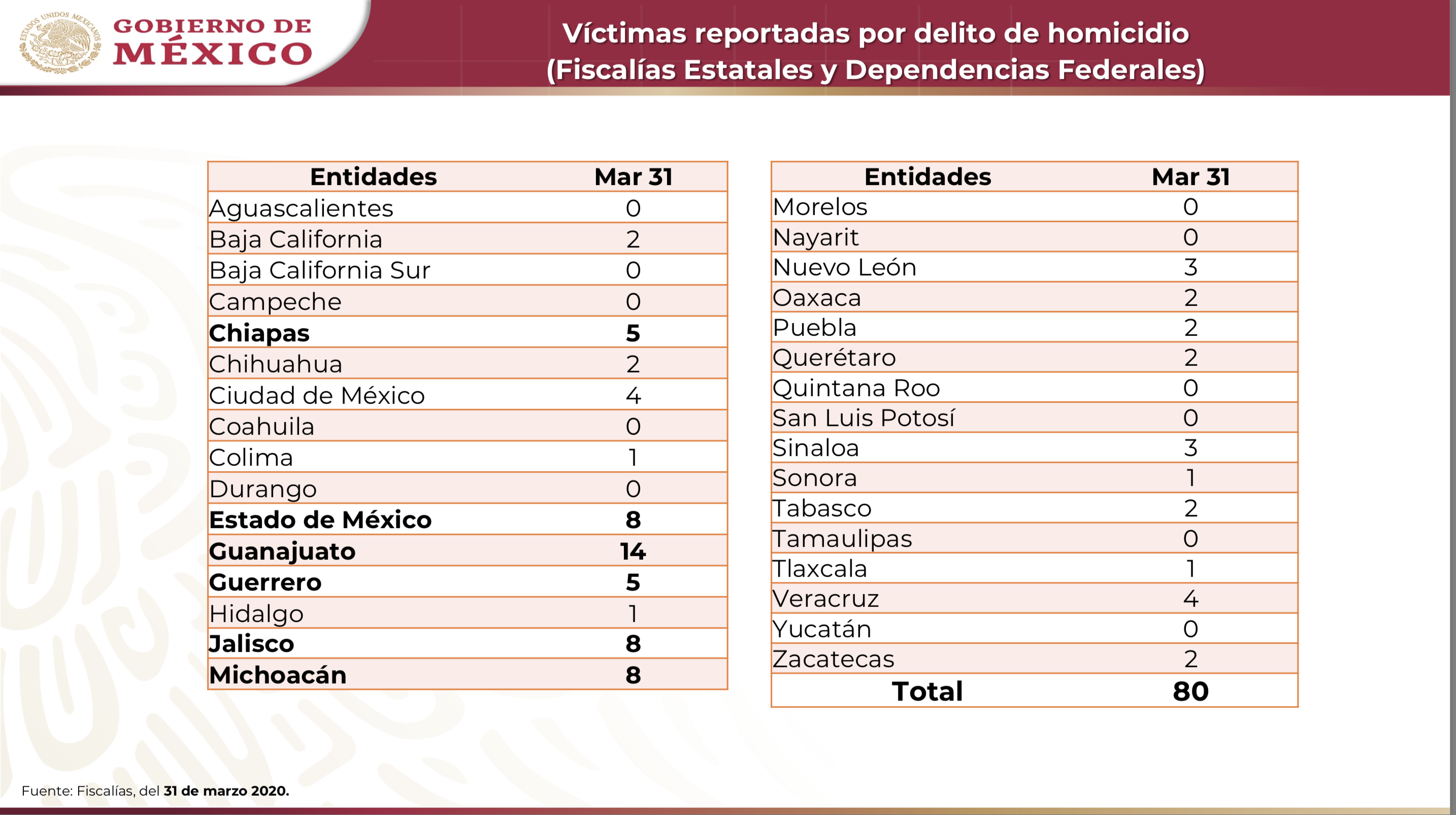 El último día de marzo, el más reciente reporte diario, se registraron 80, siendo Guanajuato la entidad con más incidencia de homicidios dolosos, con 14. Michoacán y Jalisco le siguieron, con 8.