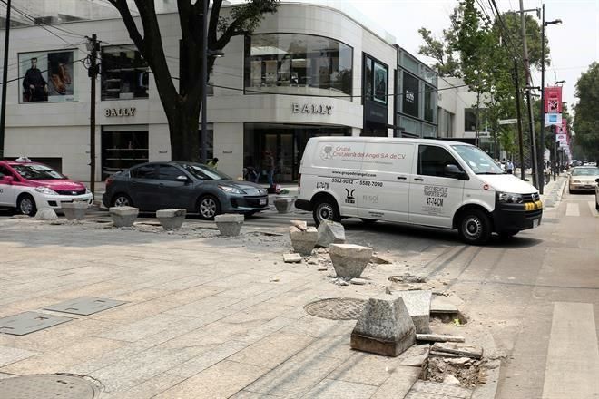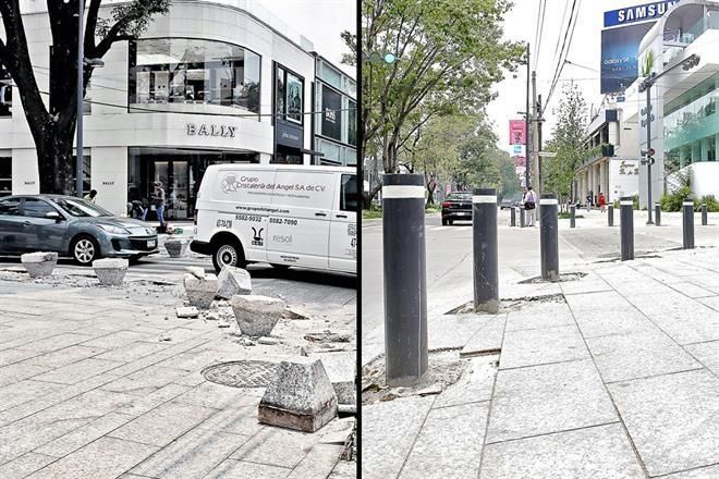 Desde el fin de semana pasado, las banquetas de Presidente Masaryk empezaron a ser modificadas nuevamente, en esta ocasión para cambiar los polémicos bolardos de granito ubicados en las esquinas, por bolardos de metal más altos y con una franja luminosa.