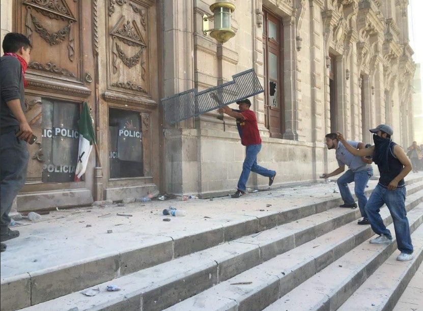 De acuerdo con los reportes, continuó, desde temprana hora 250 personas se aglutinaron en el cruce de las avenidas Aldama y Libertad, luego iniciaron los actos de vandalismo en el recinto histórico, con daños en ventanas, cristales, paredes y puertas.