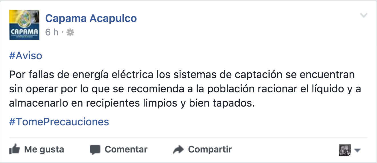 La Comisión de Agua Potable y Alcantarillado del Municipio de Acapulco, CAPAMA, informó a través de su cuenta de Facebook, que debido a fallas en la energía eléctrica, derivada de las lluvias por la tormenta tropical Max, los sistemas de captación se encuentran sin operar, por lo que en este momento el agua a utilizar es la de reserva, por lo que recomienda racionarla y almacenar.