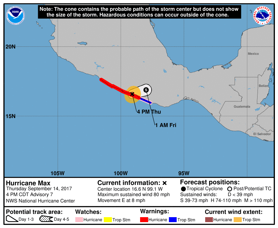 Esta tarde Max tocó tierra como huracán de categoría 1 en la zona de Copala – Marquelia, en el estado de Guerrero.