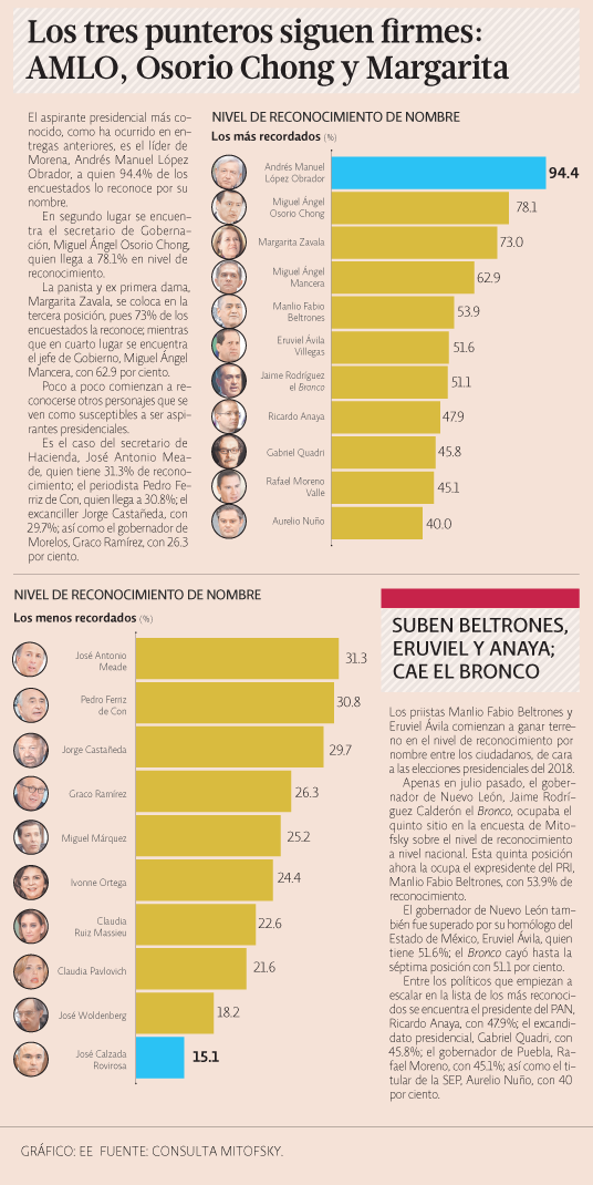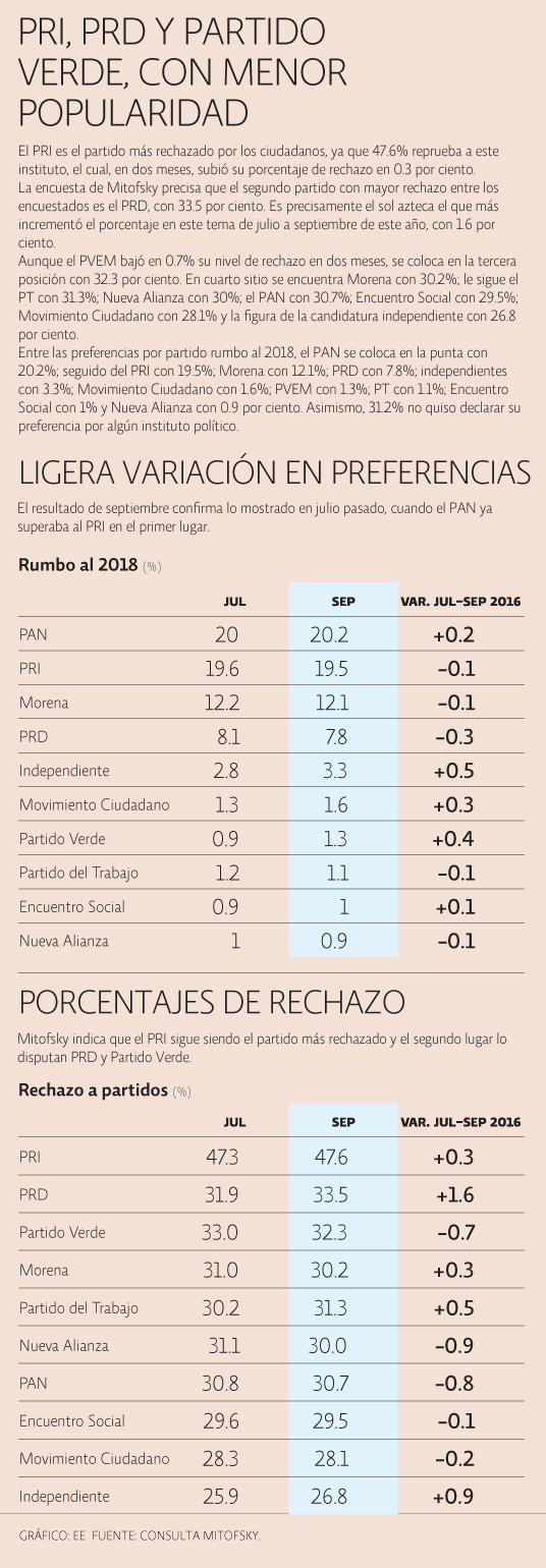 Sin embargo, Mitofsky alertó que la encuesta, aplicada a mil mexicanos con credencial para votar, no debe verse como un pronóstico, ya que “aún falta mucho para la elección”. Señaló, por su parte, que sin mencionar candidatos ni alianzas, el PAN obtiene 20.2 por ciento de las preferencias para los comicios del 2018; le sigue el PRI, con 19.5 por ciento; Morena, con 12.1 por ciento, y el PRD, con 7.8 por ciento.