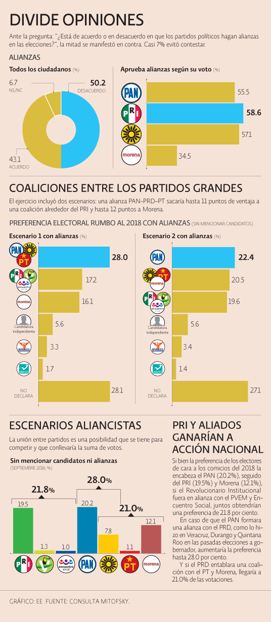 “La gran encuesta electoral. Las preferencias y escenarios para 2018”, el trabajo presentado por Mitofsky, informa que de cara a 2018, las alianzas son un punto medular para las elecciones presidenciales.