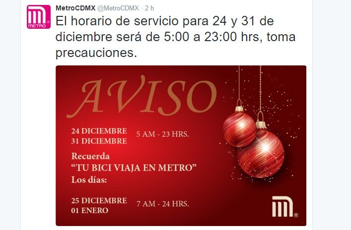 A través de las redes sociales, anunció que los jueves 24 y 31 de diciembre, las operaciones se realizarán desde las 5 de la mañana y hasta las 23 horas de la noche.