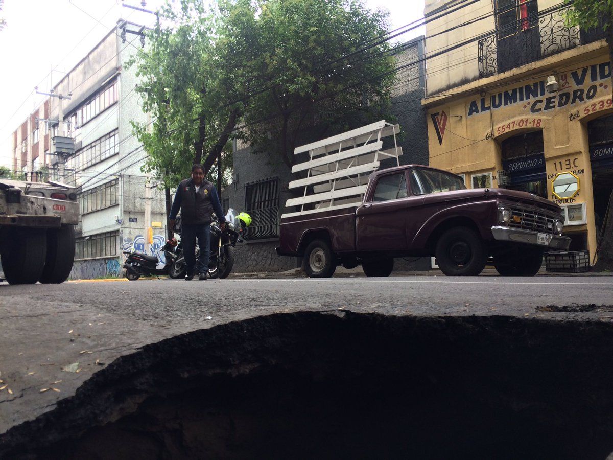 Cerca de las 13:00 h de este lunes se registró la aparición de un enorme socavón en calles de la Colonia Santa María la Ribera, y que provocara que un autobús de transporte de personal sufriera un accidente.