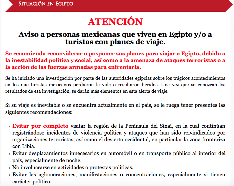 El gobierno de México, a través de la Secretaría de Relaciones Exteriores (SRE) elevó en los últimos minutos del día ayer el nivel de alerta de viaje para Egipto, tras recomendar reconsiderar o posponer para los mexicanos cualquier plan para viajar a este país.