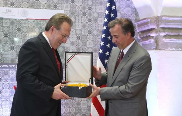 El secretario de Relaciones Exteriores, José Antonio Meade, entregó la Orden Mexicana del Águila Azteca en grado de Banda al embajador de Estados Unidos en México, Anthony Wayne, en reconocimiento a sus servicios prominentes a favor del país.
