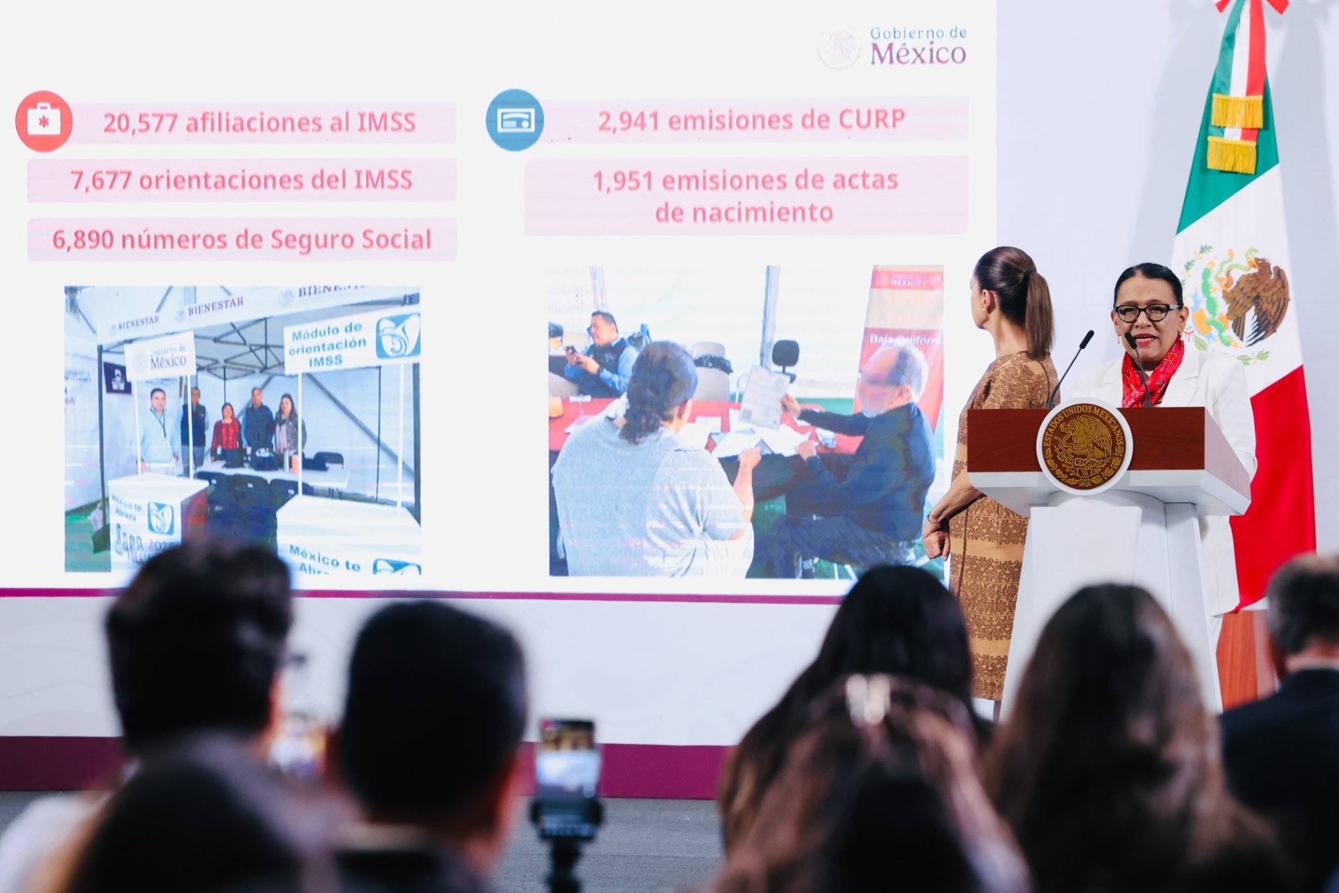 La funcionaria aseguró que se ha ofrecido respaldo a través de 34 dependencias del gobierno federal que ha incluido atención médica y psicológica; y a 20 mil 500 personas se les ha afiliado al Instituto Mexicano del Seguro Social (IMSS) de manera extraordinaria por razones humanitarias y por solidaridad con los repatriados.