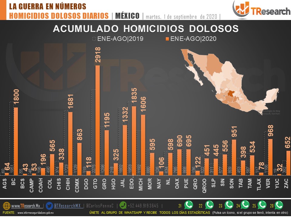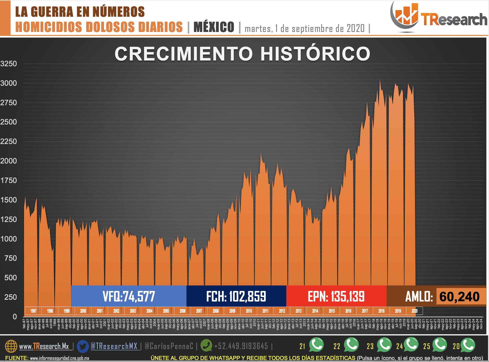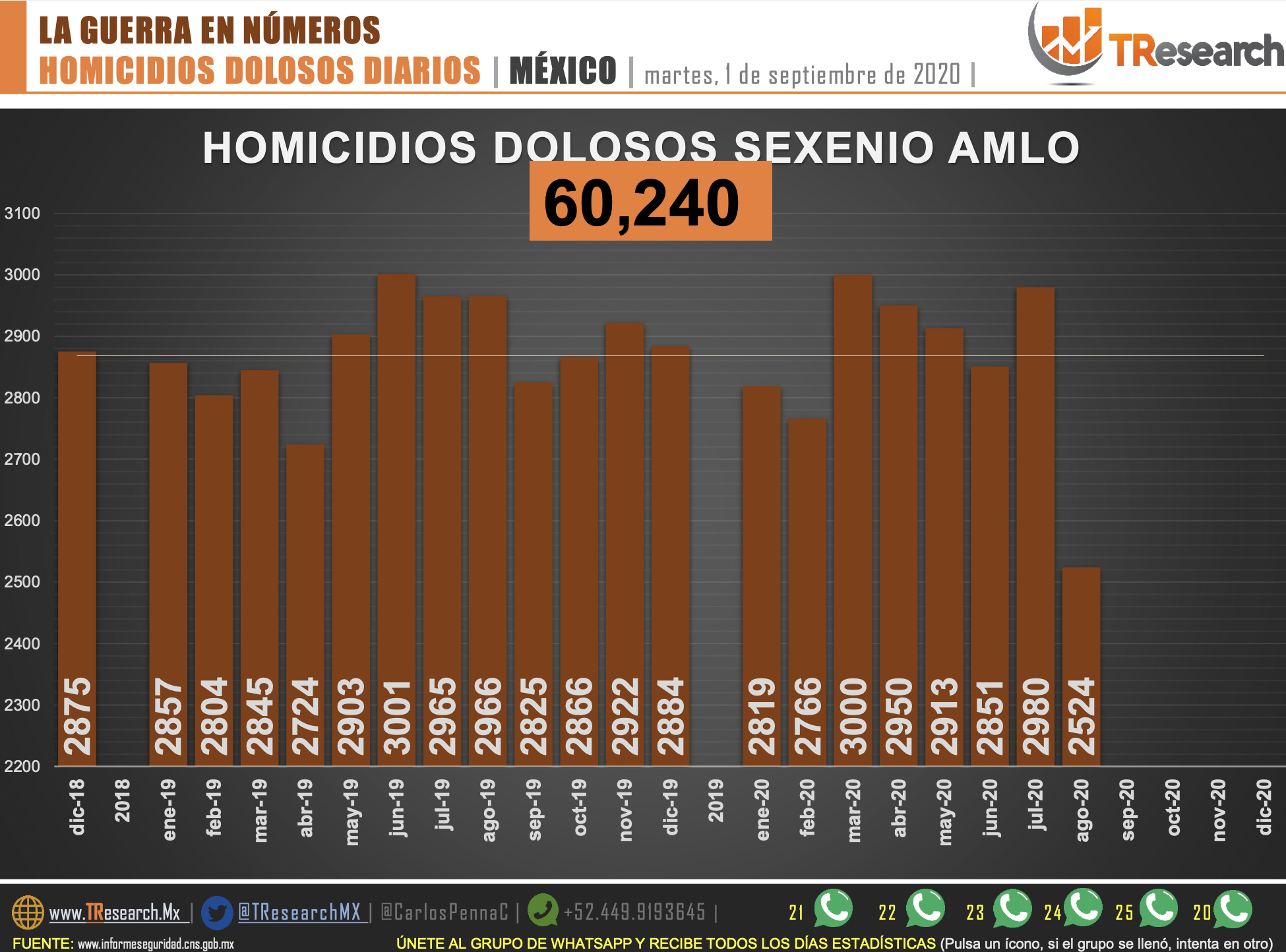 El reporte ‘MX: La Guerra en Números’, de T-ResearchMX, detalla que, de acuerdo con el registro de homicidios dolosos de la Secretaría de Seguridad y Protección Ciudadana, del 1 de diciembre de 2018 al 1 de septiembre de 2020, tiempo que lleva la actual Administración del presidente Andrés Manuel López Obrador, las fiscalías estatales y federales han registrado 60 mil 240 homicidios dolosos en México.