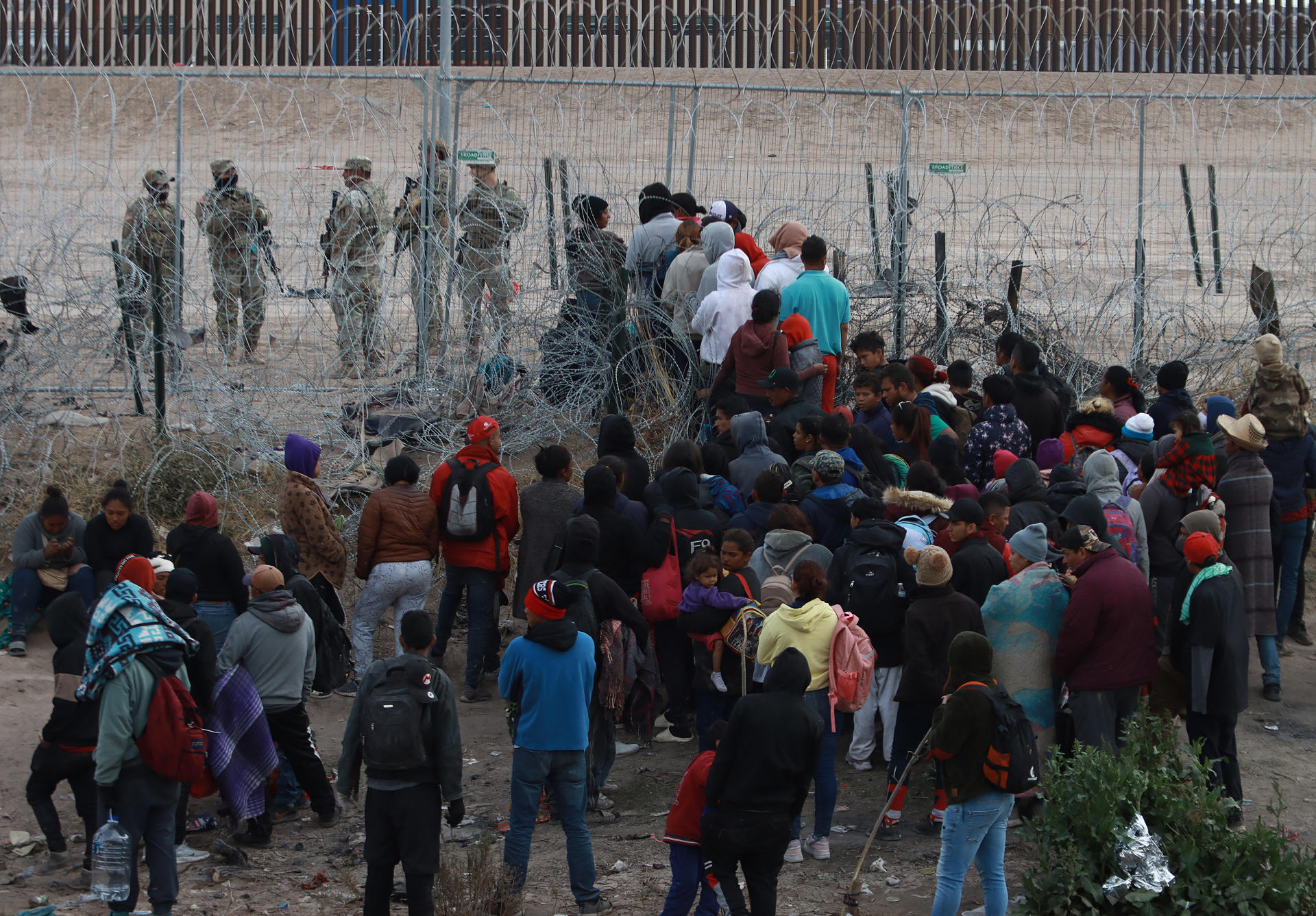 Los extranjeros llevan cinco días acampando entre el río Bravo y la cerca de alambre de navajas en la frontera de Ciudad Juárez (México) con El Paso (EE.UU.), ante la vigilancia de la Guardia Nacional de Texas