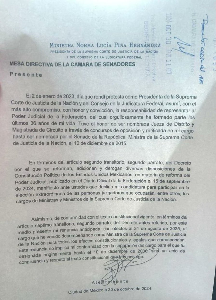 La ministra Norma Piña presentó su renuncia a la Suprema Corte de Justicia de la Nación, que se hará efectiva en 2025