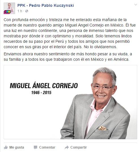 El precandidato presidencial de Perú, Pedro Pablo Kuczynski, confirmó en su cuenta de Facebook la muerte del conferencias y motivador Miguel Ángel Cornejo.