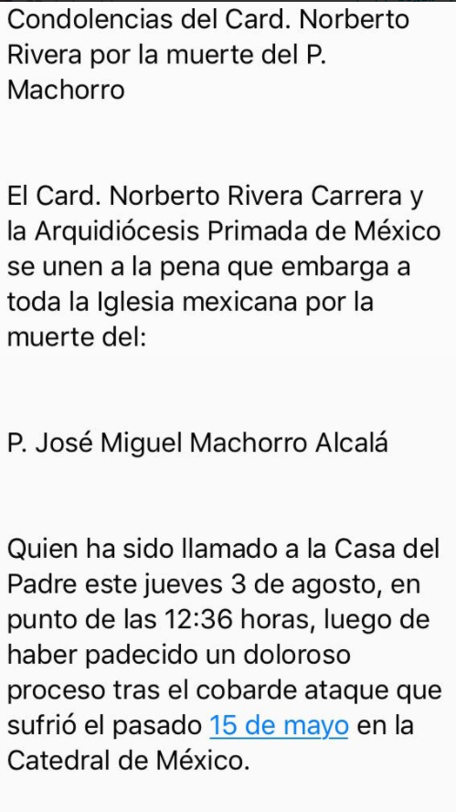 En un escrito dado a conocer por el vocero de la arquidiócesis, Hugo Valdemar, se informó que el deceso ocurrió a las 12:36 h de este jueves y extendió a la familia de Machorro las condolencias por parte del cardenal Norberto Rivera.