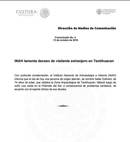 En un comunicado el Instituto Nacional de Antropología e Historia indicó Eckhard murió “a consecuencia de problemas cardiacos, de acuerdo con el reporte clínico de sus deudos”.