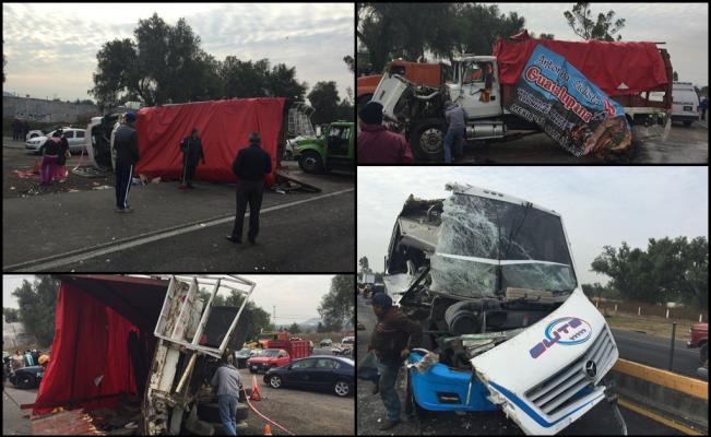 El choque entre un camión del transporte público y una camioneta tipo torton en la que viajaban peregrinos, dejó como saldo dos personas muertas y ocho más heridas.