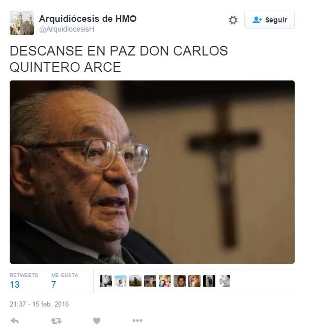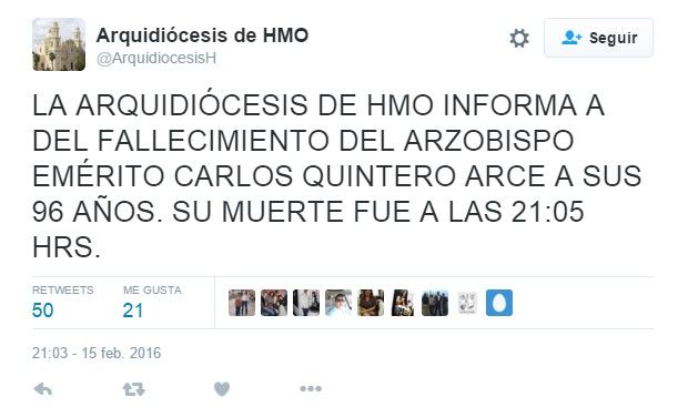 A través de la cuenta @ArquidiocesisH en Twitter, señaló: “La Arquidiócesis de Hermosillo informa del fallecimiento del arzobispo emérito Carlos Quintero Arce a sus 96 años. Su muerte fue a las 21:05 horas”.