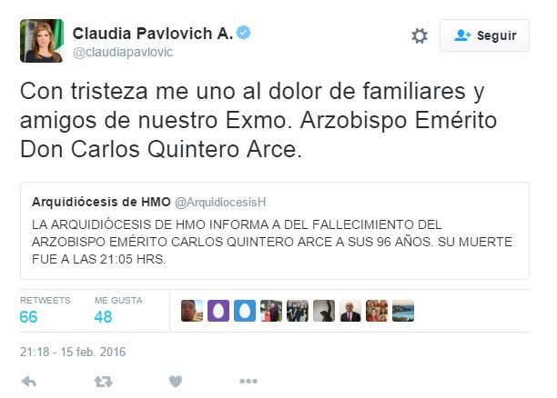 A través de Twitter señaló: “Con tristeza me uno al dolor de familiares y amigos de nuestro Exmo. Arzobispo Emérito Don Carlos Quintero Arce”.