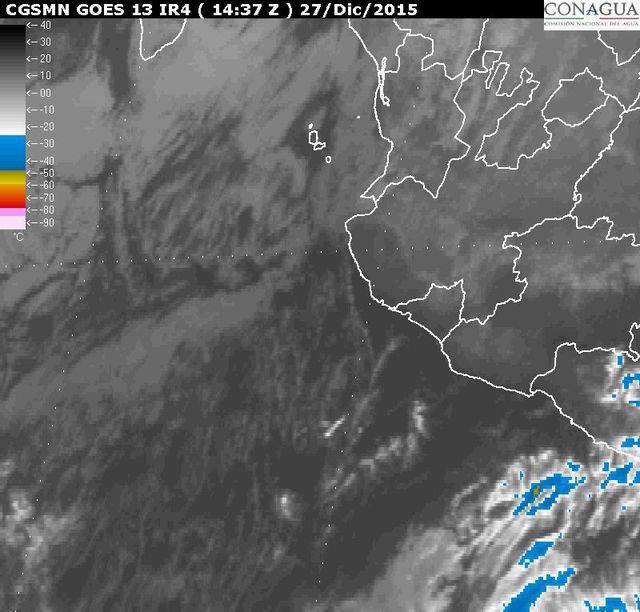 Para el Pacífico Centro se espera cielo medio nublado, probabilidad de precipitaciones aisladas de 20 por ciento en Michoacán, temperaturas calurosas durante el día y viento del norte de 15 a 30 kilómetros por hora.