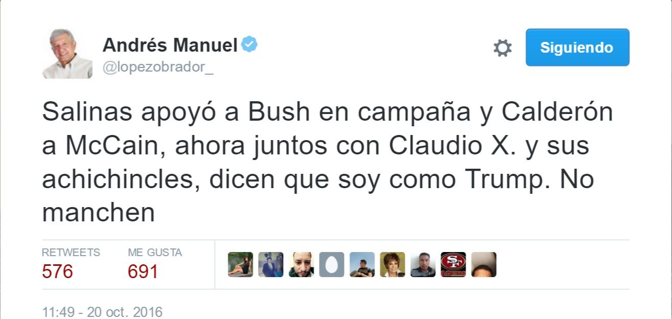 “Salinas apoyó a Bush en campaña y Calderón a McCain, ahora juntos con Claudio X. y sus achichincles, dicen que soy como Trump. No manchen”, señaló el mensaje del líder nacional de Morena.