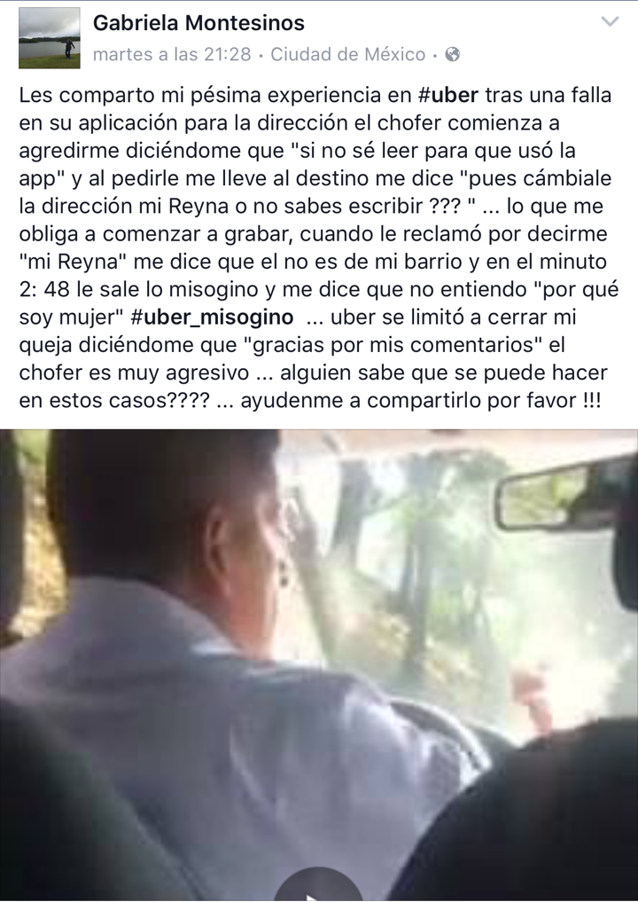 Una de las usuarias se quejó en su cuenta de Facebook por los malos tratos que recibió por parte de un conductor cuando, debido a una falla de la aplicación comienza a criticarla, preguntándole entre otras cosas “si no sabe leer, para que usa la app”, y llamándola despectivamente “mi reina”.