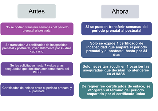 Con ello, desde el 1 de julio pasado, señaló, ya no es obligatorio para las mujeres tomar seis semanas previas al parto y seis semanas después; ahora podrán traspasar de 1 hasta 4 semanas del periodo prenatal al postnatal, lo que incrementará hasta un 66 por ciento el tiempo que pasan con sus bebés, con los beneficios que esto implica para la lactancia materna.