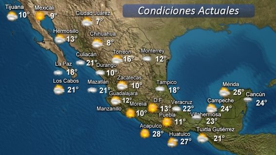 En zonas montañosas de Baja California, Sonora, Coahuila, Aguascalientes, Nuevo León, San Luis Potosí, Zacatecas, Guanajuato, Hidalgo y Estado de México las temperaturas irán de los cero a los menos cinco grados Celsius con heladas.