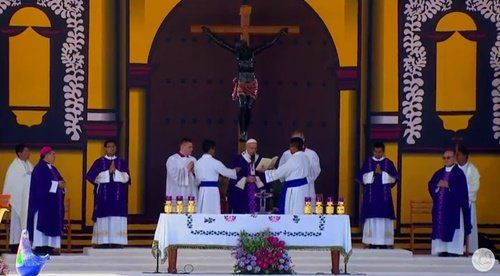 Después de arribar al lugar, el papa cambió su vestimenta por la túnica morada tradicional de la Cuaresma para oficiar la ceremonia religiosa, y los asistentes dejaron de cantar y vitorear al pontífice para concentrarse en la celebración eucarística.