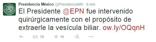 La madrugada de este 26 de junio, el presidente Enrique Peña Nieto sufrió un malestar físico, por lo que acudió al Hospital Central Militar donde a las 7:30 h fue intervenido quirúrgicamente para extraerle la vesícula biliar.