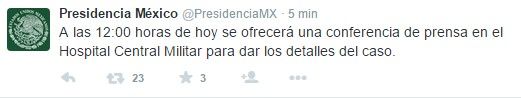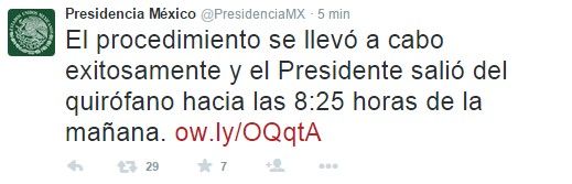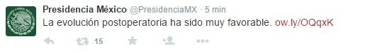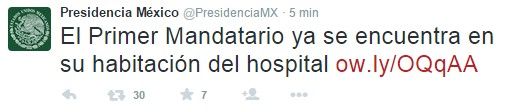 Más tarde, el presidente Enrique Peña Nieto agradeció al personal médico así como todas las muestras de cari´ño y solidaridad a través de dos mensajes en Twitter.