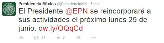 Será hasta el próximo lunes 29 de junio que el presidente Enrique Peña Nieto se reincorpore a sus actividades.