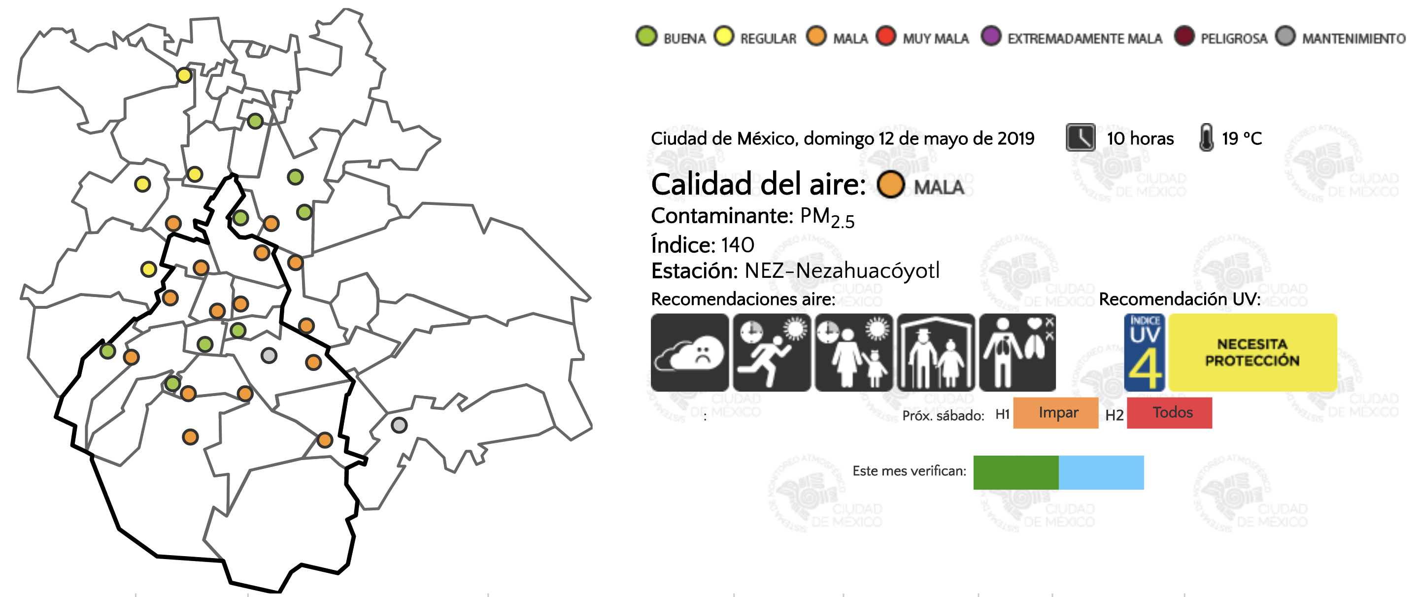 En su reporte de las 10:00 h, indicó que en Miguel Hidalgo, Azcapotzalco, Cuauhtémoc y Cuajimalpa la calidad del aire también es mala, toda vez que el índice de contaminación en todas las alcaldías supera los 130 puntos.