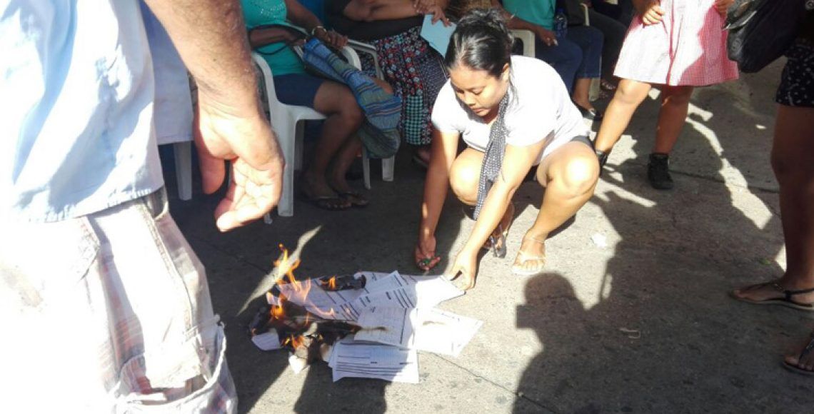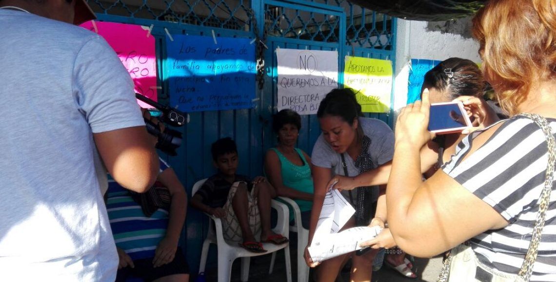Aproximadamente a las 9:00 h, unos 50 padres que mantienen tomada la institución educativa en rechazo al nombramiento de la nueva directora, Rosa Bustos Colón, amontonaron los documentos oficiales y les prendieron fuego.