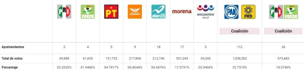 De acuerdo con el informe, la coalición de los partidos Acción Nacional (PAN) y de la Revolución Democrática (PRD) aventaja en porcentaje de votación al lograr un millón 038 mil 562 votos, lo que representa el 32.7315 por ciento de la votación; muy por debajo, la alianza de los partidos Revolucionario Institucional (PRI) y Verde Ecologista (PVEM), con 574 mil 483 votos, equivalente al 18.0740 por ciento, seguido por Morena, con 551 mil 245 votos, es decir, 17.3731 por ciento de la votación.
