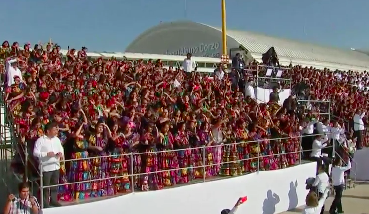 El papa se acercó a las gradas instaladas en el Aeropuerto Internacional de Tuxtla Gutiérrez, ocupadas por mil niños vestidos con trajes típicos del estado que cantan y ondean pañuelos