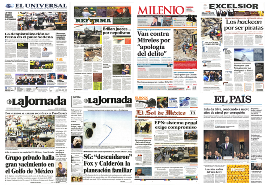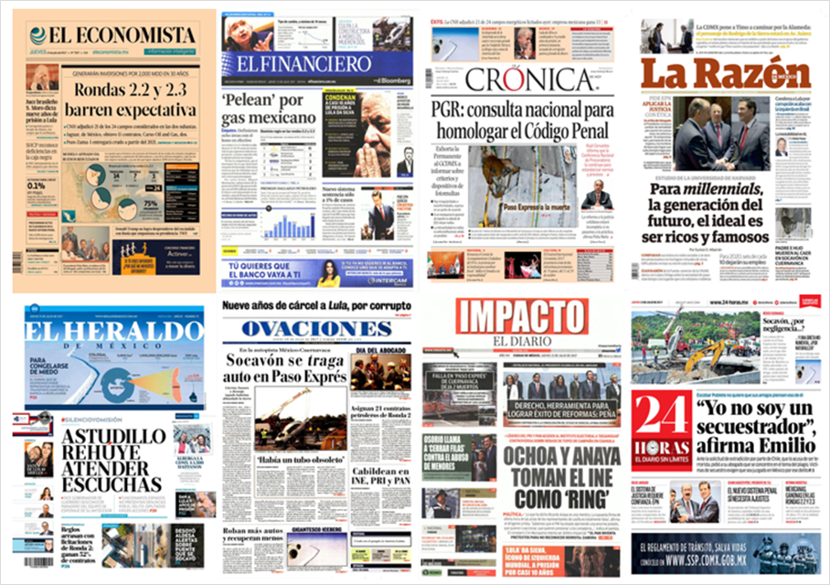 Este jueves, los principales periódicos de México destacaron en sus primeras planas que el titular de la Secretaría de Comunicaciones y Transportes (SCT), Gerardo Ruiz Esparza, aseguró que se deslindarán responsabilidades para conocer a los responsables de los daños provocados por el socavón en el Paso Express de Cuernavaca que dejó dos personas muertas.