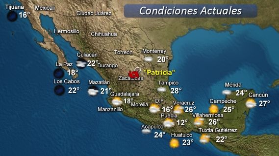 El Huracán Patricia se degradó a tormenta tropical y se prevé originará lluvias de muy fuertes a intensas en las zonas noreste y occidente de México, así como rachas de viento y oleaje elevado en estados del Pacífico central y el noreste del territorio nacional.