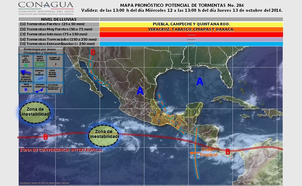 Para Veracruz, Chiapas y Oaxaca se esperan tormentas puntuales muy fuertes; en Tabasco, Campeche y Quintana Roo serán puntuales fuertes y para Yucatán se prevén lluvias con intervalos de chubascos; indicó el Servicio Meteorológico Nacional (SMN).