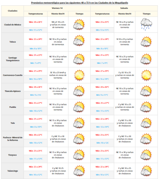 Indicó que además se presentarán vientos de 15 a 30 kilómetros por hora, con rachas de hasta 40 kilómetros por hora; así como temperaturas máximas entre 24 y 26 grados centígrados; y mínimas de 11 a 13 grados centígrados.