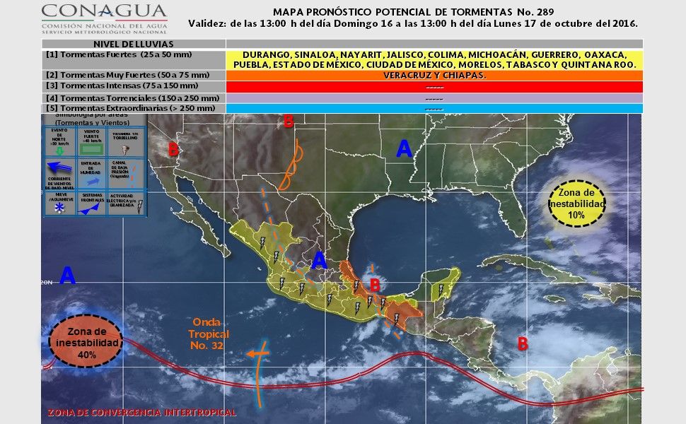 En su pronóstico para todo el país indicó que se prevén tormentas muy fuertes en zonas de Chiapas; tormentas fuertes en zonas del Estado de México, la Ciudad de México, Puebla, Morelos, Guerrero, Oaxaca y Veracruz; así como lluvias con intervalos de chubascos en Durango, Sinaloa, Nayarit, Jalisco, Colima, Michoacán, Hidalgo, Tlaxcala, Tabasco, Campeche y Quintana Roo, así como lluvias escasas en Chihuahua, Tamaulipas, San Luis Potosí, Zacatecas, Guanajuato, Querétaro y Yucatán.