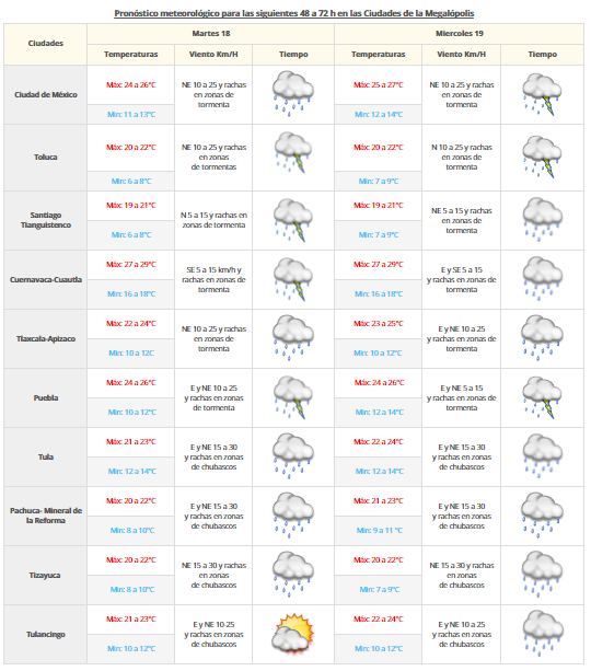 La Mesa Central registrará cielo parcialmente nublado, 40 por ciento de tormentas puntuales fuertes en Puebla y Morelos, lluvias con intervalos de chubascos en Hidalgo y Tlaxcala, y lluvias escasas o lloviznas en Guanajuato y Querétaro. Así como temperaturas frías por la mañana y noche con heladas en zonas serranas.