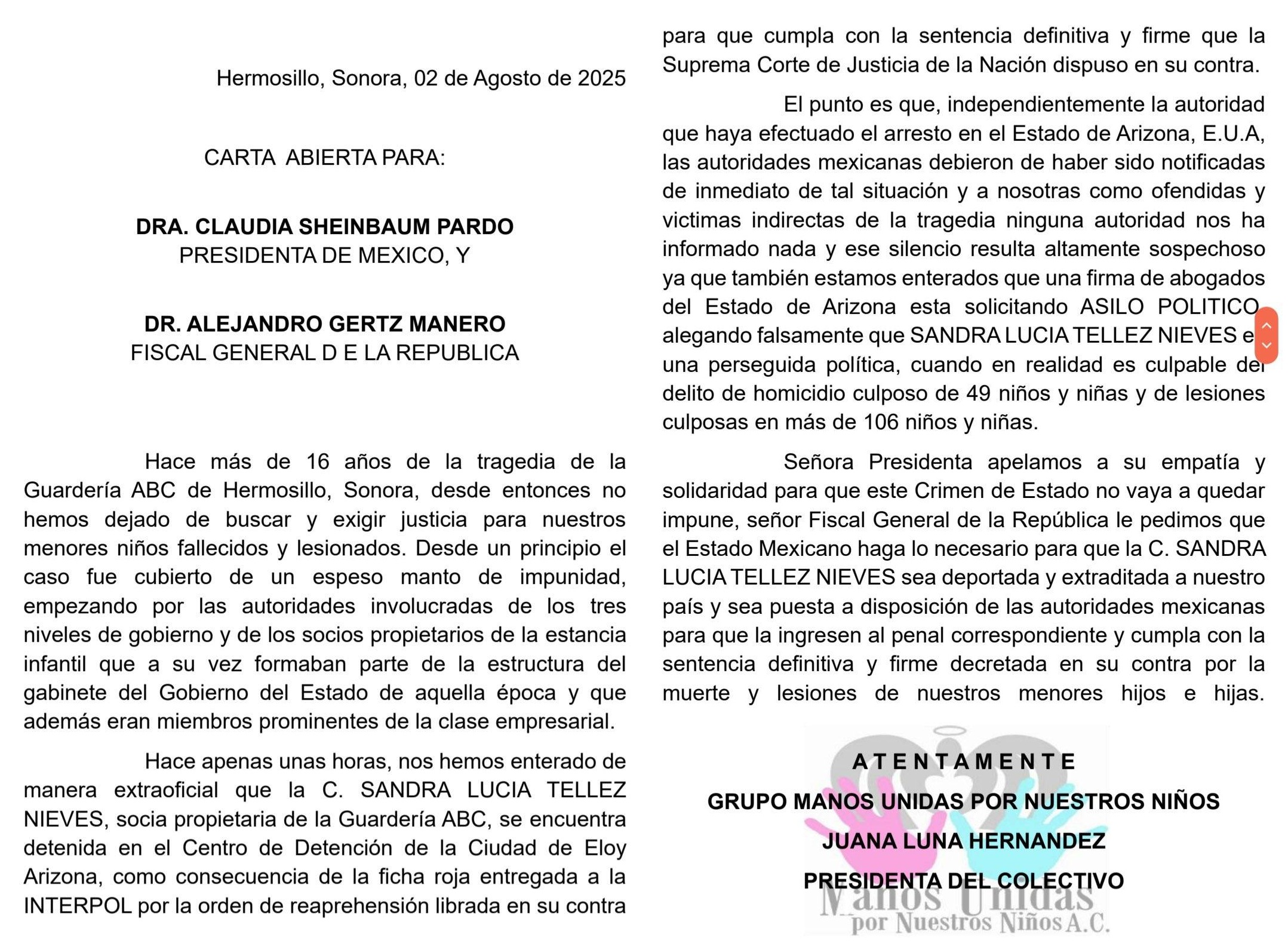 En una carta dirigida a la presidenta Claudia Sheinbaum y al fiscal general de la República, Alejandro Gertz Manero, el Grupo Manos Unidas por Nuestros Niños, conformado por familiares de las víctimas de aquel suceso, afirmó haberse enterado de “manera extraoficial” de la detención de Sandra Téllez, en Eloy, Arizona, EE.UU.
