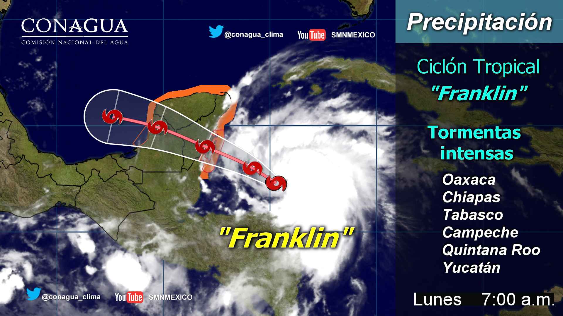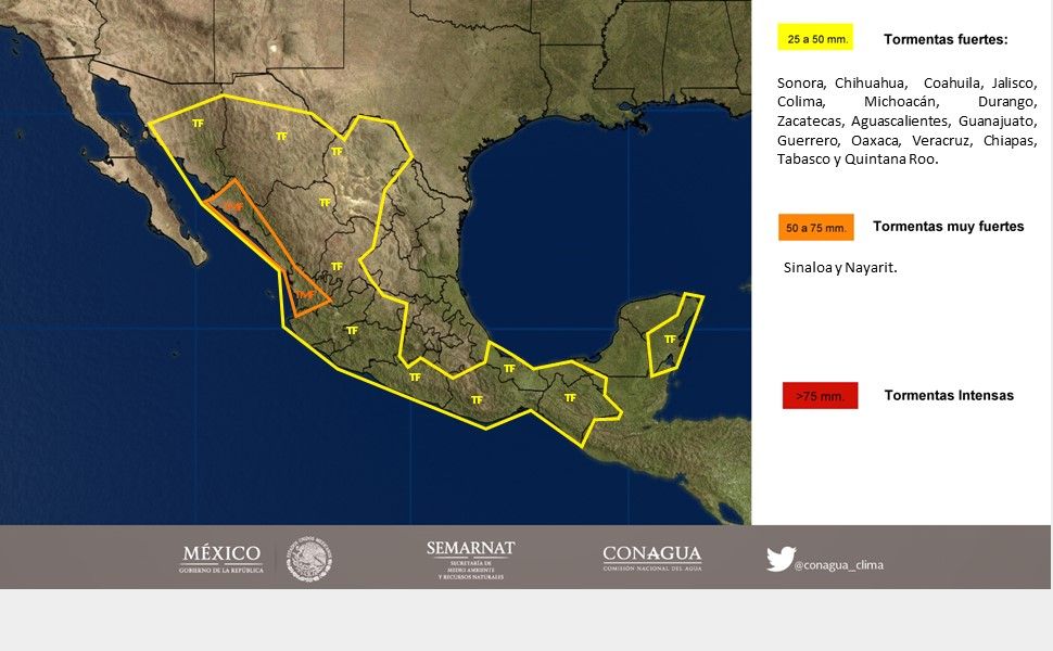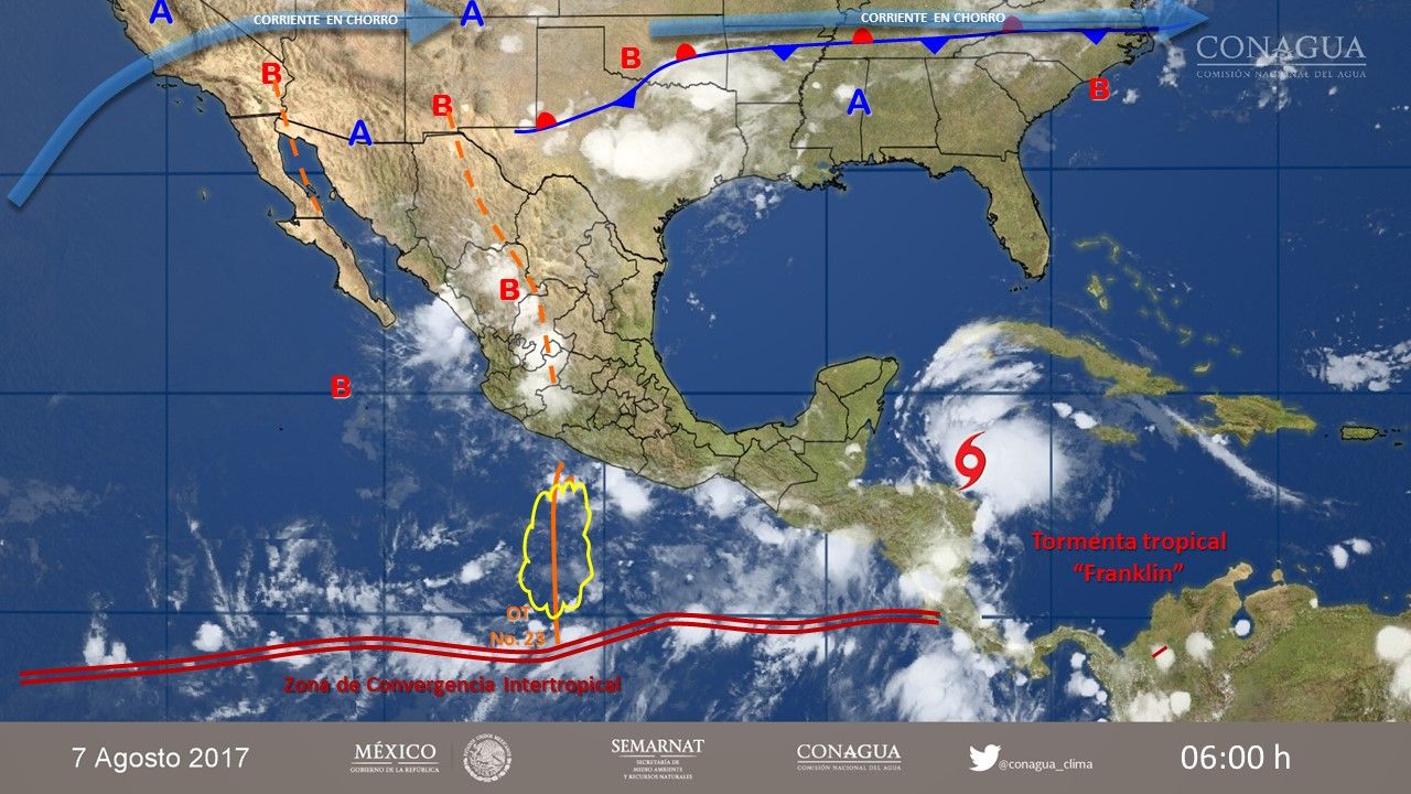 También se prevé el desarrollo de nublados con tormentas de corta duración, acompañados de actividad eléctrica y viento fuerte, originados debido a la onda tropical 23 que se localizará al sur de Jalisco y Colima, por un canal de baja presión sobre el norte y centro del país y la tormenta tropical Franklin, que arrastrará humedad del Océano Pacífico al sureste del país.