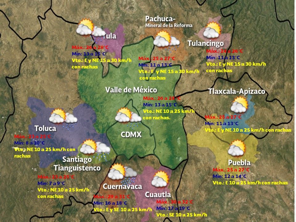 En lo referente a las temperaturas, la Ciudad de México registrará una máxima de 26 a 28 grados y una mínima de 13 a 15 grados, con viento del sureste de 10 a 25 km/h con rachas de 40 km/h.