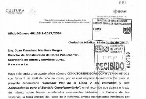 En un comunicado destacó que el Instituto Nacional de Antropología e Historia (INAH) autorizó la construcción del corredor vial del Metrobús en Reforma, que incluye la habilitación de los carriles confinados, la construcción de 30 estaciones de embarque-desembarque, dos estaciones terminales y la colocación de mobiliario y señalética urbanos, principalmente.