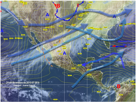En su pronóstico de temperaturas dijo que se prevé que sean de menos cinco grados Celsius con heladas en zonas montañosas de Chihuahua y Durango, y de cero a menos cinco grados con heladas en zonas montañosas de Baja California, Sonora, Coahuila, Zacatecas y Estado de México.