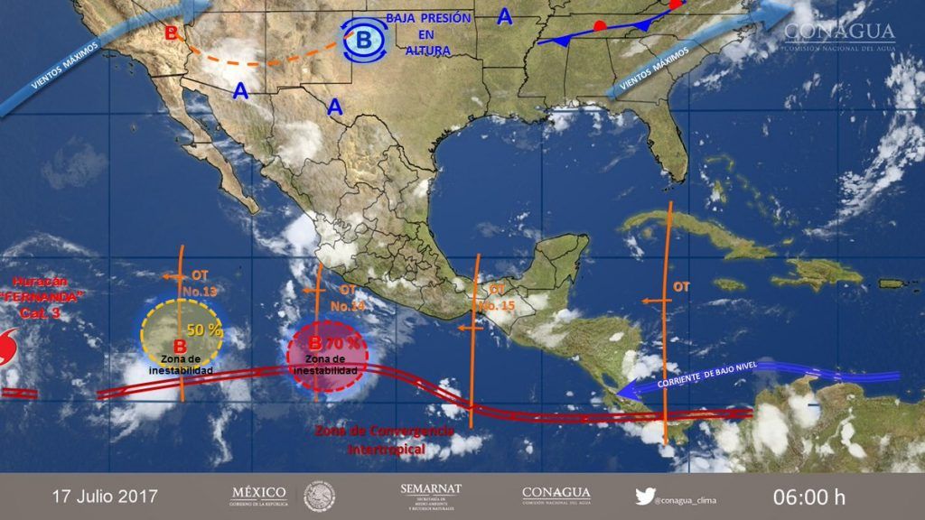 En el reporte más reciente del organismo dependiente de la Comisión Nacional del Agua (Conagua) señaló que la onda tropical 14 asociada con una zona de inestabilidad con potencial ciclónico al sur de las costas de Colima y Michoacán, la onda tropical 15 al sur de Oaxaca, el canal de baja presión que permanecerá en el norte del país, y una nueva onda tropical frente a las costas de Quintana Roo, originarán potencial de lluvias.